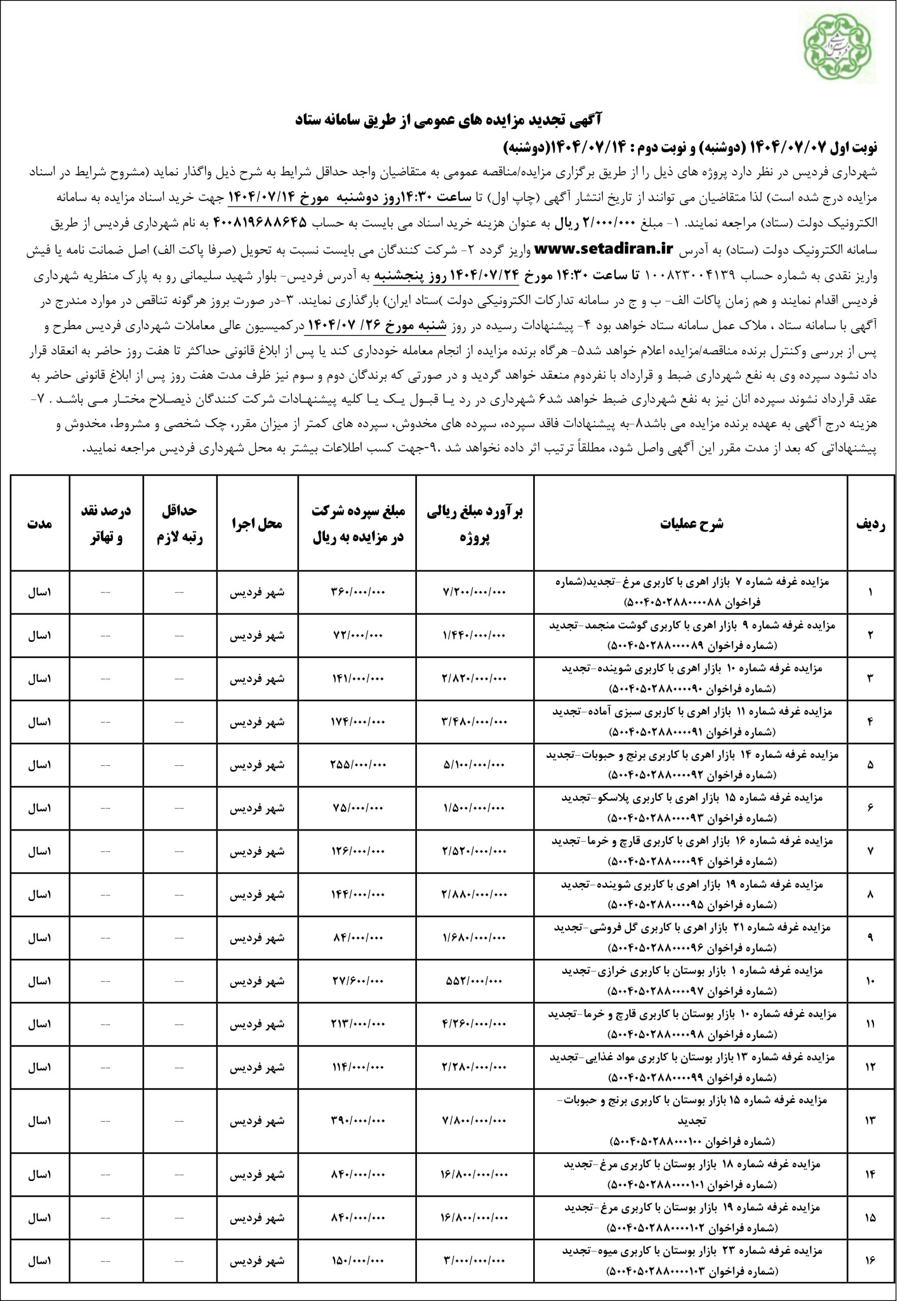 شهرداری فردیس در نظر دارد پروژه های ذیل را از طریق برگزاری مزایده/مناقصه عمومی به متقاضیان واجد حداقل شرایط به شرح ذیل واگذار نماید (مشروح شرایط در اسناد مزایده درج شده است) لذا متقاضیان می توانند از تاریخ انتشار آگهی (چاپ اول) تا ساعت ۱۴:۳۰روز دوشنبه مورخ ۱۴/۰۷/۱۴۰۴ جهت خرید اسناد مزایده به سامانه الکترونیک دولت (ستاد) مراجعه نمایند. ۱- مبلغ ۰۰۰/۰۰۰/۲ ریال به عنوان هزینه خرید اسناد می بایست به حساب ۴۰۰۸۱۹۶۸۸۶۴۵ به نام شهرداری فردیس از طریق سامانه الکترونیک دولت (ستاد) به آدرس www.setadiran.ir واریز گردد ۲- شرکت کنندگان می بایست نسبت به تحویل (صرفا پاکت الف) اصل ضمانت نامه یا فیش واریز نقدی به شماره حساب ۱۰۰۸۲۳۰۰۴۱۳۹ تا ساعت ۱۴:۳۰ مورخ ۲۴/۰۷/۱۴۰۴ روز پنجشنبه به آدرس فردیس- بلوار شهید سلیمانی رو به پارک منظریه شهرداری فردیس اقدام نمایند و هم زمان پاکات الف- ب و ج در سامانه تدارکات الکترونیکی دولت )ستاد ایران) بارگذاری نمایند. ۳-در صورت بروز هرگونه تناقص در موارد مندرج در آگهی با سامانه ستاد ، ملاک عمل سامانه ستاد خواهد بود ۴- پیشنهادات رسیده در روز شنبه مورخ ۲۶/ ۰۷/۱۴۰۴ درکمیسیون عالی معاملات شهرداری فردیس مطرح و پس از بررسی وکنترل برنده مناقصه/مزایده اعلام خواهد شد۵- هرگاه برنده مزایده از انجام معامله خودداری کند یا پس از ابلاغ قانونی حداکثر تا هفت روز حاضر به انعقاد قرار داد نشود سپرده وی به نفع شهرداری ضبط و قرارداد با نفردوم منعقد خواهد گردید و در صورتی که برندگان دوم و سوم نیز ظرف مدت هفت روز پس از ابلاغ قانونی حاضر به عقد قرارداد نشوند سپرده انان نیز به نفع شهرداری ضبط خواهد شد۶ شهرداری در رد یـا قبـول یـک یـا کلیه پیشنهـادات شرکت کنندگان ذیصـلاح مختـار مـی باشـد . ۷- هزینه درج آگهی به عهده برنده مزایده می باشد۸-به پیشنهادات فاقد سپرده، سپرده های مخدوش، سپرده های کمتر از میزان مقرر، چک شخصی و مشروط، مخدوش و پیشنهاداتی که بعد از مدت مقرر این آگهی واصل شود، مطلقاً ترتیب اثر داده نخواهد شد. ۹-جهت کسب اطلاعات بیشتر به محل شهرداری فردیس مراجعه نمایید.