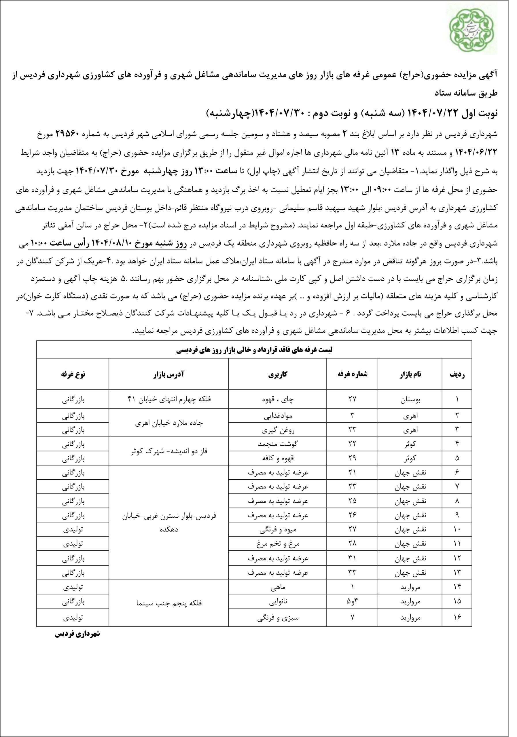 شهرداری فردیس در نظر دارد بر اساس ابلاغ بند ۲ مصوبه سیصد و هشتاد و سومین جلسه رسمی شورای اسلامی شهر فردیس به شماره ۲۹۵۶۰ مورخ ۲۲/۰۶/۱۴۰۴ و مستند به ماده ۱۳ آئین نامه مالی شهرداری ها اجاره اموال غیر منقول را از طریق برگزاری مزایده حضوری (حراج) به متقاضیان واجد شرایط به شرح ذیل واگذار نماید.۱- متقاضیان می توانند از تاریخ انتشار آگهی (چاپ اول) تا ساعت ۱۳:۰۰ روز چهارشنبه مورخ ۳۰/۰۷/۱۴۰۴ جهت بازدید حضوری از محل غرفه ها از ساعت ۰۹:۰۰ الی ۱۳:۰۰ بجز ایام تعطیل نسبت به اخذ برگ بازدید و هماهنگی با مدیریت ساماندهی مشاغل شهری و فرآورده های کشاورزی شهرداری به آدرس فردیس :بلوار شهید سپهبد قاسم سلیمانی -روبروی درب نیروگاه منتظر قائم-داخل بوستان فردیس ساختمان مدیریت ساماندهی مشاغل شهری و فرآورده های کشاورزی-طبقه اول مراجعه نمایند. (مشروح شرایط در اسناد مزایده درج شده است)۲- محل حراج در سالن آمفی تئاتر شهرداری فردیس واقع در جاده ملارد ،بعد از سه راه حافظیه روبروی شهرداری منطقه یک فردیس در روز شنبه مورخ ۱۰/۰۸/۱۴۰۴ رأس ساعت ۱۰:۰۰ می باشد.۳-در صورت بروز هرگونه تناقض در موارد مندرج در آگهی با سامانه ستاد ایران،ملاک عمل سامانه ستاد ایران خواهد بود .۴-هریک از شرکن کنندگان در زمان برگزاری حراج می بایست با در دست داشتن اصل و کپی کارت ملی ،شناسنامه در محل برگزاری حضور بهم رسانند .۵-هزینه چاپ آگهی و دستمزد کارشناسی و کلیه هزینه های متعلقه (مالیات بر ارزش افزوده و … )بر عهده برنده مزایده حضوری (حراج) می باشد که به صورت نقدی (دستگاه کارت خوان)در محل برگذاری حراج می بایست پرداخت گردد . ۶ – شهرداری در رد یـا قبـول یـک یـا کلیه پیشنهـادات شرکت کنندگان ذیصـلاح مختـار مـی باشـد. ۷-جهت کسب اطلاعات بیشتر به محل مدیریت ساماندهی مشاغل شهری و فرآورده های کشاورزی فردیس مراجعه نمایید.