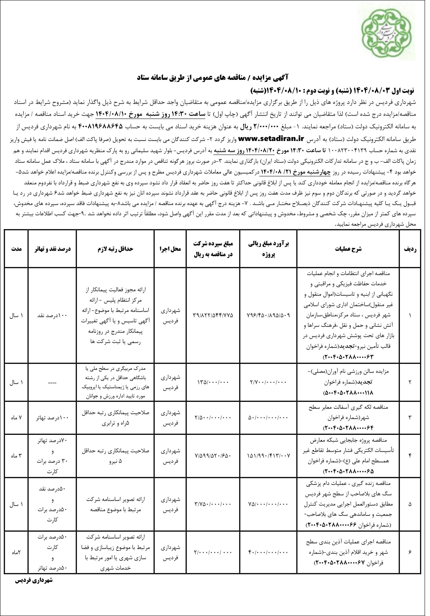 شهرداری فردیس در نظر دارد پروژه های ذیل را از طریق برگزاری مزایده/مناقصه عمومی به متقاضیان واجد حداقل شرایط به شرح ذیل واگذار نماید (مشروح شرایط در اسناد مناقصه/مزایده درج شده است) لذا متقاضیان می توانند از تاریخ انتشار آگهی (چاپ اول) تا ساعت ۱۴:۳۰ روز شنبه مورخ ۱۰/۰۸/۱۴۰۴ جهت خرید اسناد مناقصه / مزایده به سامانه الکترونیک دولت (ستاد) مراجعه نمایند. ۱- مبلغ ۰۰۰/۰۰۰/۲ ریال به عنوان هزینه خرید اسناد می بایست به حساب ۴۰۰۸۱۹۶۸۸۶۴۵ به نام شهرداری فردیس از طریق سامانه الکترونیک دولت (ستاد) به آدرس www.setadiran.ir واریز گردد ۲- شرکت کنندگان می بایست نسبت به تحویل (صرفا پاکت الف) اصل ضمانت نامه یا فیش واریز نقدی به شماره حساب ۱۰۰۸۲۳۰۰۴۱۳۹ تا ساعت ۱۴:۳۰ مورخ ۲۰/۰۸/۱۴۰۴ روز سه شنبه به آدرس فردیس- بلوار شهید سلیمانی رو به پارک منظریه شهرداری فردیس اقدام نمایند و هم زمان پاکات الف- ب و ج در سامانه تدارکات الکترونیکی دولت (ستاد ایران) بارگذاری نمایند. ۳-در صورت بروز هرگونه تناقص در موارد مندرج در آگهی با سامانه ستاد ، ملاک عمل سامانه ستاد خواهد بود ۴- پیشنهادات رسیده در روز چهارشنبه مورخ ۲۱/ ۰۸/۱۴۰۴ درکمیسیون عالی معاملات شهرداری فردیس مطرح و پس از بررسی وکنترل برنده مناقصه/مزایده اعلام خواهد شد۵- هرگاه برنده مناقصه/مزایده از انجام معامله خودداری کند یا پس از ابلاغ قانونی حداکثر تا هفت روز حاضر به انعقاد قرار داد نشود سپرده وی به نفع شهرداری ضبط و قرارداد با نفردوم منعقد خواهد گردید و در صورتی که برندگان دوم و سوم نیز ظرف مدت هفت روز پس از ابلاغ قانونی حاضر به عقد قرارداد نشوند سپرده انان نیز به نفع شهرداری ضبط خواهد شد۶ شهرداری در رد یـا قبـول یـک یـا کلیه پیشنهـادات شرکت کنندگان ذیصـلاح مختـار مـی باشـد . ۷- هزینه درج آگهی به عهده برنده مناقصه / مزایده می باشد۸-به پیشنهادات فاقد سپرده، سپرده های مخدوش، سپرده های کمتر از میزان مقرر، چک شخصی و مشروط، مخدوش و پیشنهاداتی که بعد از مدت مقرر این آگهی واصل شود، مطلقاً ترتیب اثر داده نخواهد شد. ۹-جهت کسب اطلاعات بیشتر به محل شهرداری فردیس مراجعه نمایید.