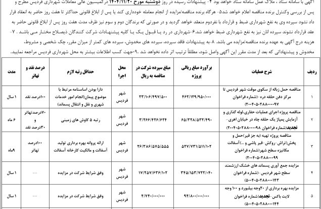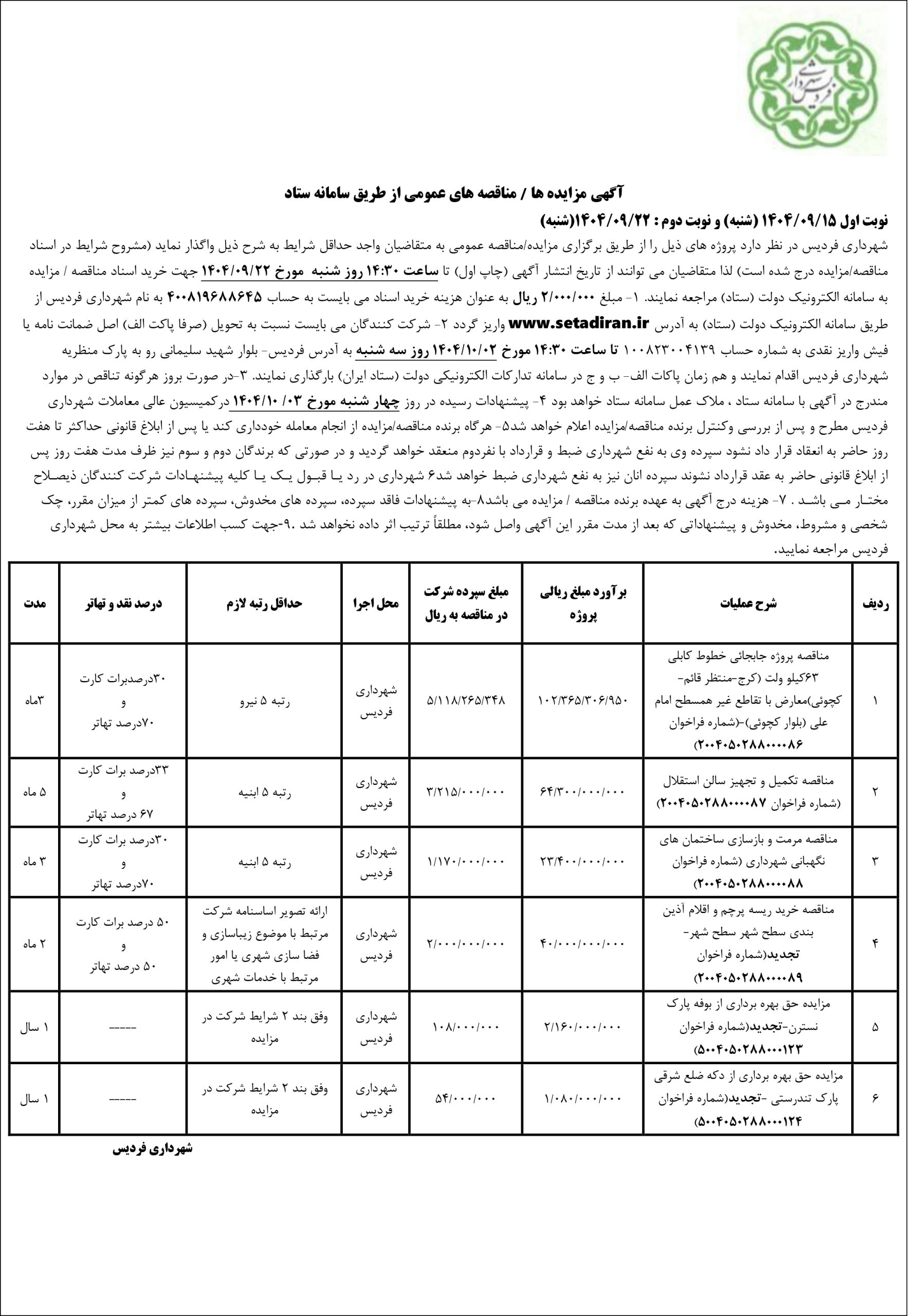 شهرداری فردیس در نظر دارد پروژه های ذیل را از طریق برگزاری مزایده/مناقصه عمومی به متقاضیان واجد حداقل شرایط به شرح ذیل واگذار نماید (مشروح شرایط در اسناد مناقصه/مزایده درج شده است) لذا متقاضیان می توانند از تاریخ انتشار آگهی (چاپ اول) تا ساعت ۱۴:۳۰ روز شنبه مورخ ۲۲/۰۹/۱۴۰۴ جهت خرید اسناد مناقصه / مزایده به سامانه الکترونیک دولت (ستاد) مراجعه نمایند. ۱- مبلغ ۰۰۰/۰۰۰/۲ ریال به عنوان هزینه خرید اسناد می بایست به حساب ۴۰۰۸۱۹۶۸۸۶۴۵ به نام شهرداری فردیس از طریق سامانه الکترونیک دولت (ستاد) به آدرس www.setadiran.ir واریز گردد ۲- شرکت کنندگان می بایست نسبت به تحویل (صرفا پاکت الف) اصل ضمانت نامه یا فیش واریز نقدی به شماره حساب ۱۰۰۸۲۳۰۰۴۱۳۹ تا ساعت ۱۴:۳۰ مورخ ۰۲/۱۰/۱۴۰۴ روز سه شنبه به آدرس فردیس- بلوار شهید سلیمانی رو به پارک منظریه شهرداری فردیس اقدام نمایند و هم زمان پاکات الف- ب و ج در سامانه تدارکات الکترونیکی دولت (ستاد ایران) بارگذاری نمایند. ۳-در صورت بروز هرگونه تناقص در موارد مندرج در آگهی با سامانه ستاد ، ملاک عمل سامانه ستاد خواهد بود ۴- پیشنهادات رسیده در روز چهار شنبه مورخ ۰۳/ ۱۰/۱۴۰۴ درکمیسیون عالی معاملات شهرداری فردیس مطرح و پس از بررسی وکنترل برنده مناقصه/مزایده اعلام خواهد شد۵- هرگاه برنده مناقصه/مزایده از انجام معامله خودداری کند یا پس از ابلاغ قانونی حداکثر تا هفت روز حاضر به انعقاد قرار داد نشود سپرده وی به نفع شهرداری ضبط و قرارداد با نفردوم منعقد خواهد گردید و در صورتی که برندگان دوم و سوم نیز ظرف مدت هفت روز پس از ابلاغ قانونی حاضر به عقد قرارداد نشوند سپرده انان نیز به نفع شهرداری ضبط خواهد شد۶ شهرداری در رد یـا قبـول یـک یـا کلیه پیشنهـادات شرکت کنندگان ذیصـلاح مختـار مـی باشـد . ۷- هزینه درج آگهی به عهده برنده مناقصه / مزایده می باشد۸-به پیشنهادات فاقد سپرده، سپرده های مخدوش، سپرده های کمتر از میزان مقرر، چک شخصی و مشروط، مخدوش و پیشنهاداتی که بعد از مدت مقرر این آگهی واصل شود، مطلقاً ترتیب اثر داده نخواهد شد. ۹-جهت کسب اطلاعات بیشتر به محل شهرداری فردیس مراجعه نمایید.