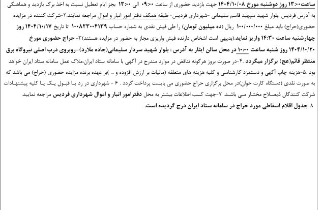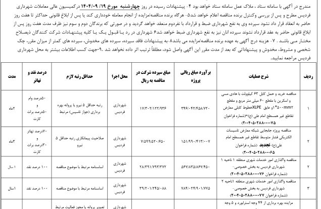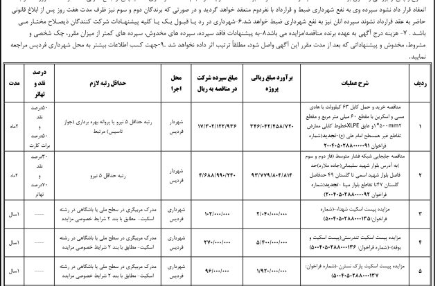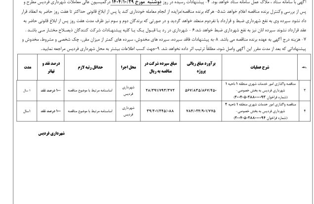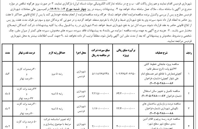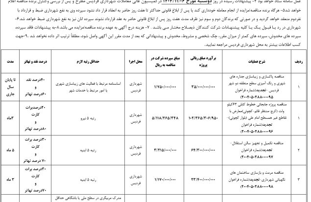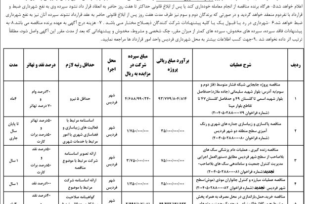 شهرداری فردیس در نظر دارد پروژه های ذیل را از طریق برگزاری مزایده/مناقصه عمومی به متقاضیان واجد حداقل شرایط به شرح ذیل واگذار نماید (مشروح شرایط در اسناد مناقصه درج شده است) لذا متقاضیان می توانند از تاریخ انتشار آگهی (چاپ اول) تا ساعت ۱۴:۰۰ روز چهارشنبه مورخ ۰۸/۱۱/۱۴۰۴ جهت خرید اسناد مزایده/مناقصه به سامانه الکترونیک دولت (ستاد) مراجعه نمایند. ۱- مبلغ ۰۰۰/۰۰۰/۲ ریال به عنوان هزینه خرید اسناد می بایست به حساب ۴۰۰۸۱۹۶۸۸۶۴۵ به نام شهرداری فردیس از طریق سامانه الکترونیک دولت (ستاد) به آدرس www.setadiran.ir واریز گردد ۲- شرکت کنندگان می بایست نسبت به تحویل (صرفاً پاکت الف) اصل ضمانت نامه یا فیش واریز نقدی به شماره حساب ۱۰۰۸۲۳۰۰۴۱۳۹ تا ساعت ۱۴:۰۰ مورخ ۱۸/۱۱/۱۴۰۴ روز شنبه به آدرس فردیس- بلوار شهید سلیمانی رو به پارک منظریه شهرداری فردیس اقدام نمایند و هم زمان پاکات الف- ب و ج در سامانه تدارکات الکترونیکی دولت (ستاد ایران) بارگذاری نمایند. ۳-در صورت بروز هرگونه تناقص در موارد مندرج در آگهی با سامانه ستاد ، ملاک عمل سامانه ستاد خواهد بود ۴- پیشنهادات رسیده در روز دوشنبه مورخ ۲۰/۱۱/۱۴۰۴ درکمیسیون عالی معاملات شهرداری فردیس مطرح و پس از بررسی وکنترل برنده مناقصه اعلام خواهد شد۵- هرگاه برنده مناقصه/مزایده از انجام معامله خودداری کند یا پس از ابلاغ قانونی حداکثر تا هفت روز حاضر به انعقاد قرار داد نشود سپرده وی به نفع شهرداری ضبط و قرارداد با نفردوم منعقد خواهد گردید و در صورتی که برندگان دوم و سوم نیز ظرف مدت هفت روز پس از ابلاغ قانونی حاضر به عقد قرارداد نشوند سپرده انان نیز به نفع شهرداری ضبط خواهد شد.۶-شهرداری در رد یـا قبـول یـک یـا کلیه پیشنهـادات شرکت کنندگان ذیصـلاح مختـار مـی باشـد . ۷- هزینه درج آگهی به عهده برنده مناقصه/مزایده می باشد. ۸-به پیشنهادات فاقد سپرده، سپرده های مخدوش، سپرده های کمتر از میزان مقرر، چک شخصی و مشروط، مخدوش و پیشنهاداتی که بعد از مدت مقرر این آگهی واصل شود، مطلقاً ترتیب اثر داده نخواهد شد. ۹-جهت کسب اطلاعات بیشتر به محل شهرداری فردیس مراجعه نمایید.