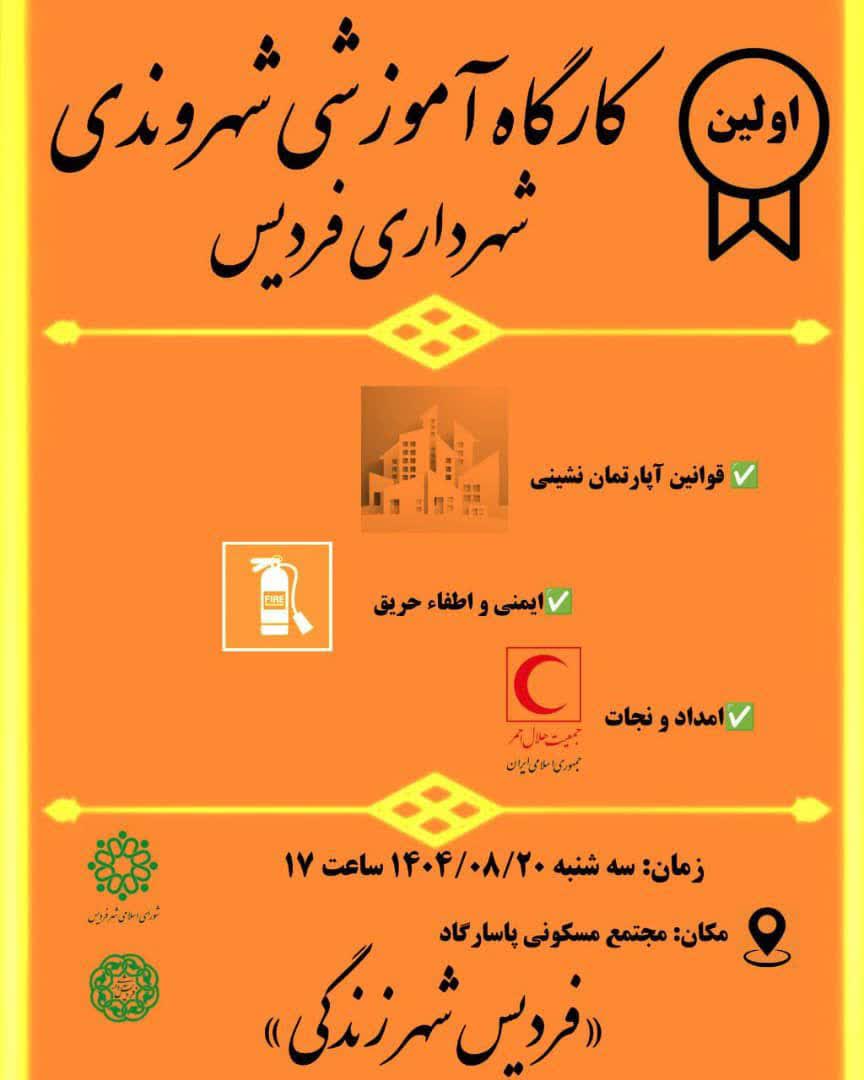 وی خاطر نشان کرد که در این کارگاه : دوره های تخصصی قوانین آپارتمان نشینی ؛ ایمنی و اطفا حریق و امداد و نجات توسط اساتید برجسته برای ساکنین مجتمع های مسکونی شهر فردیس آموزش داده خواهد شد .